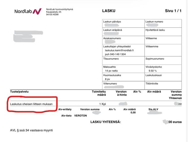 Nordlabin laskun mukana tuleva liite tarvitaan mukaan korvauskäsittelyyn, pelkkä laskun ensimmäinen sivu ei riitä (ei käy ilmi käyntipäivä, kokeiden lukumäärää eikä mahdolliset palvelumaksut).